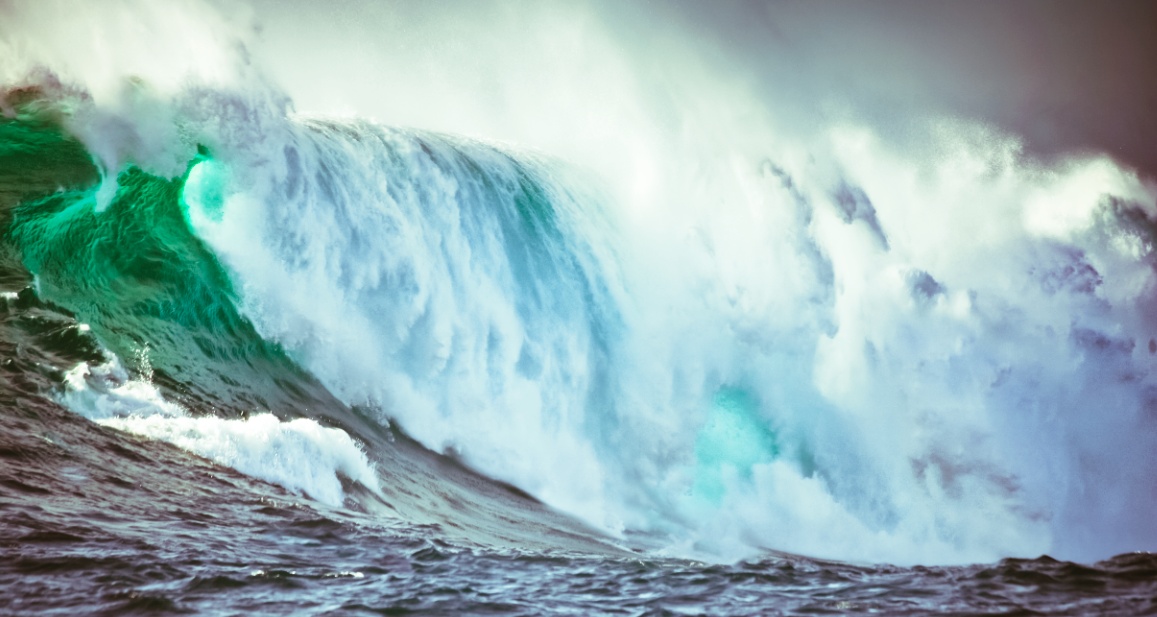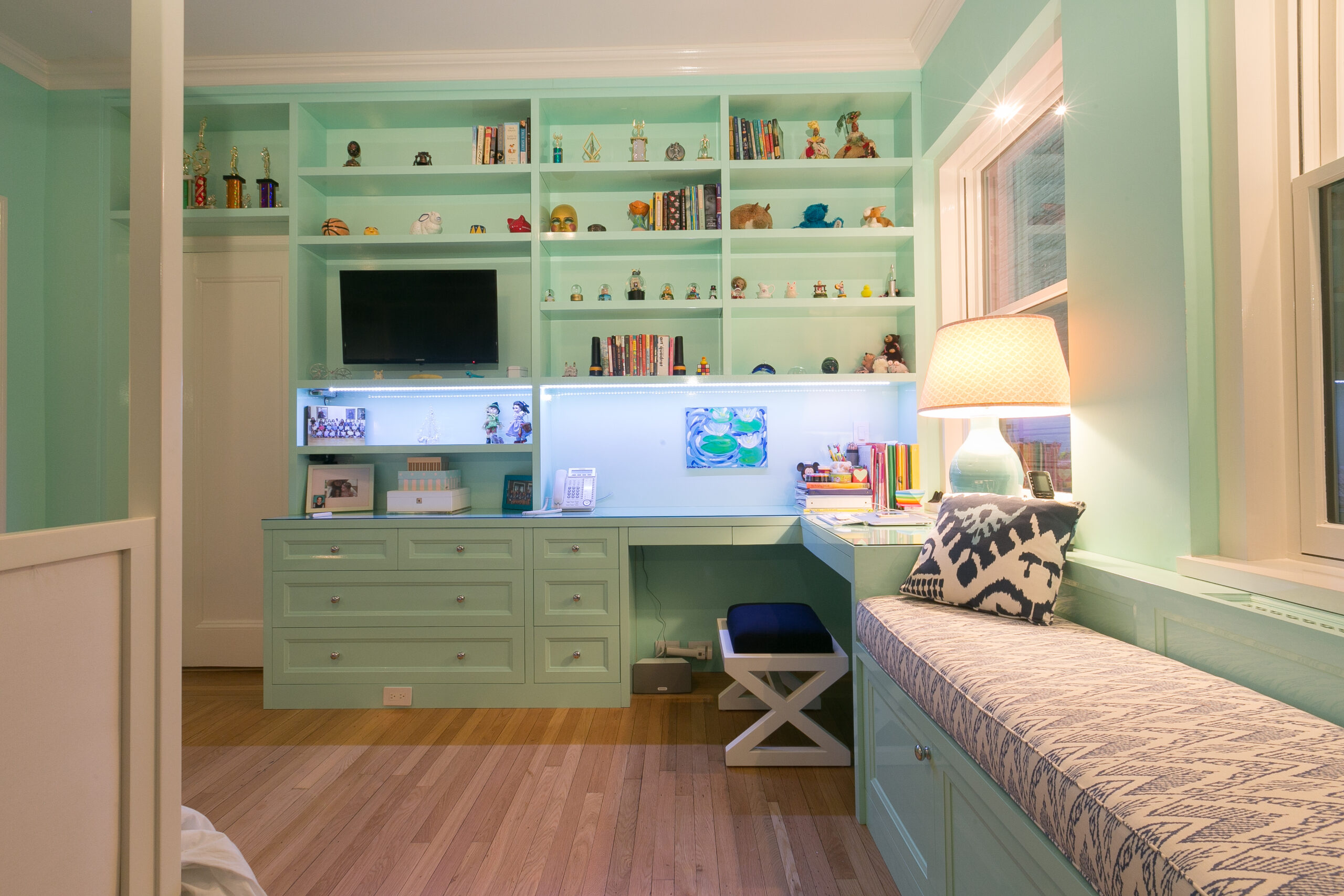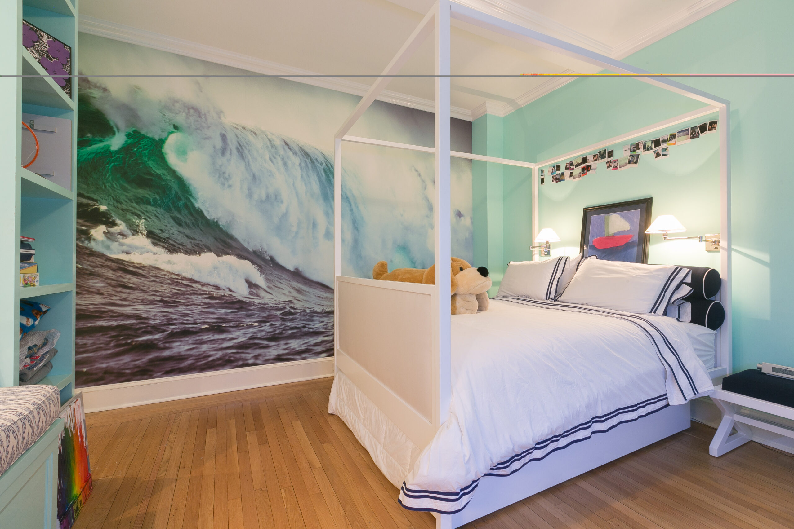 The children’s room that merges functionality with vibrant aesthetics. Key elements include a turquoise wall with a wave mural, modern furniture for storage, a warm wooden floor, and a cozy window seat for reading. The bathroom features a comfortable bathtub and serene leaf-patterned wallpaper, creating a dynamic, practical, and imaginative space for children.
