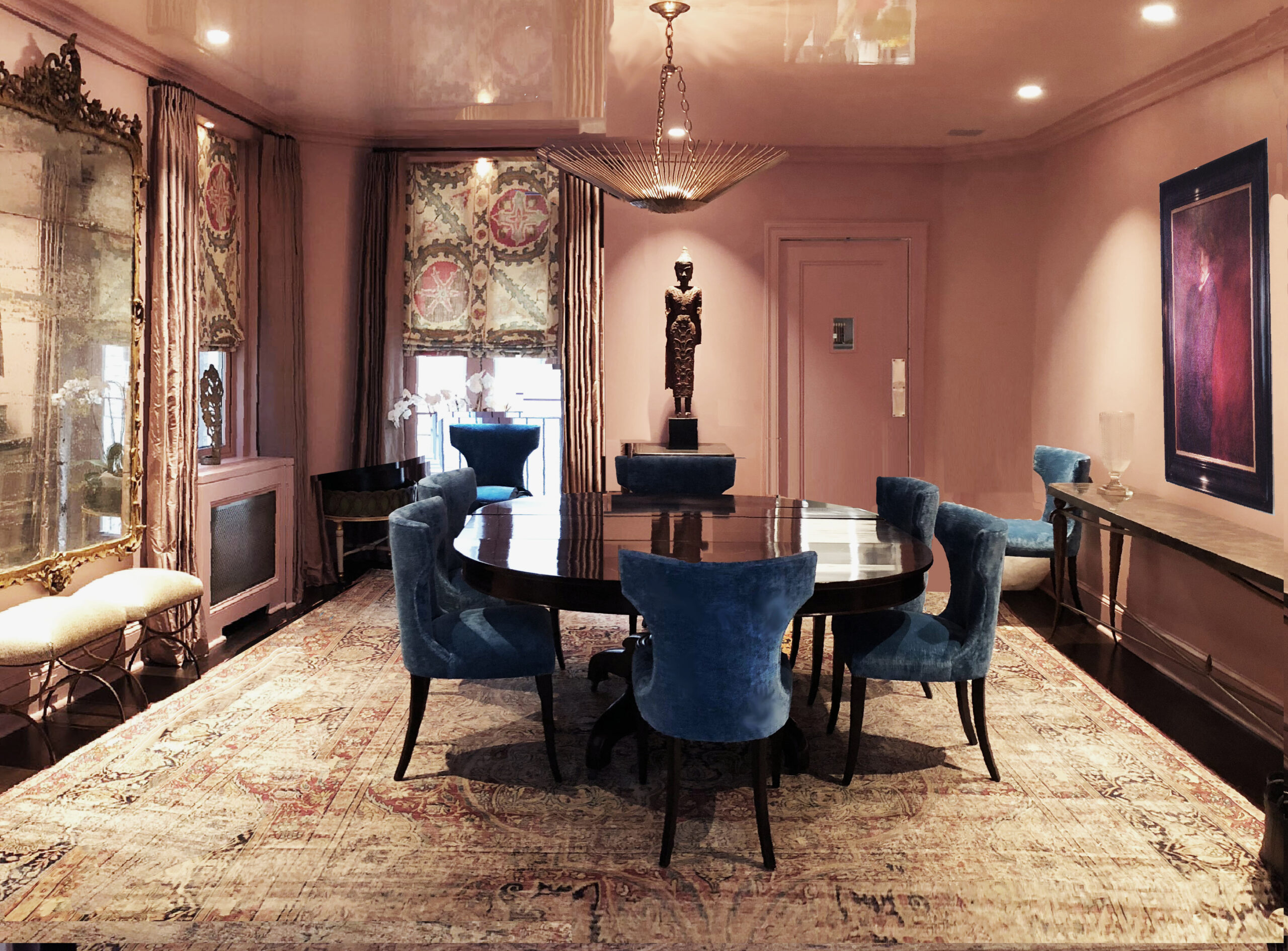 The interior showcases an elegant and sophisticated design. Soft pink walls create a warm atmosphere, while high-quality furniture, including a round dining table and plush blue chairs, adds a touch of luxury. Large windows adorned with uniquely patterned drapes allow natural light to fill the space. Decorative elements like a large mirror, a sculpture, and artwork enhance the room’s character and depth. A traditional-style carpet ties the look together, blending comfort with modern aesthetics. Overall, it embodies a harmonious and inviting environment.