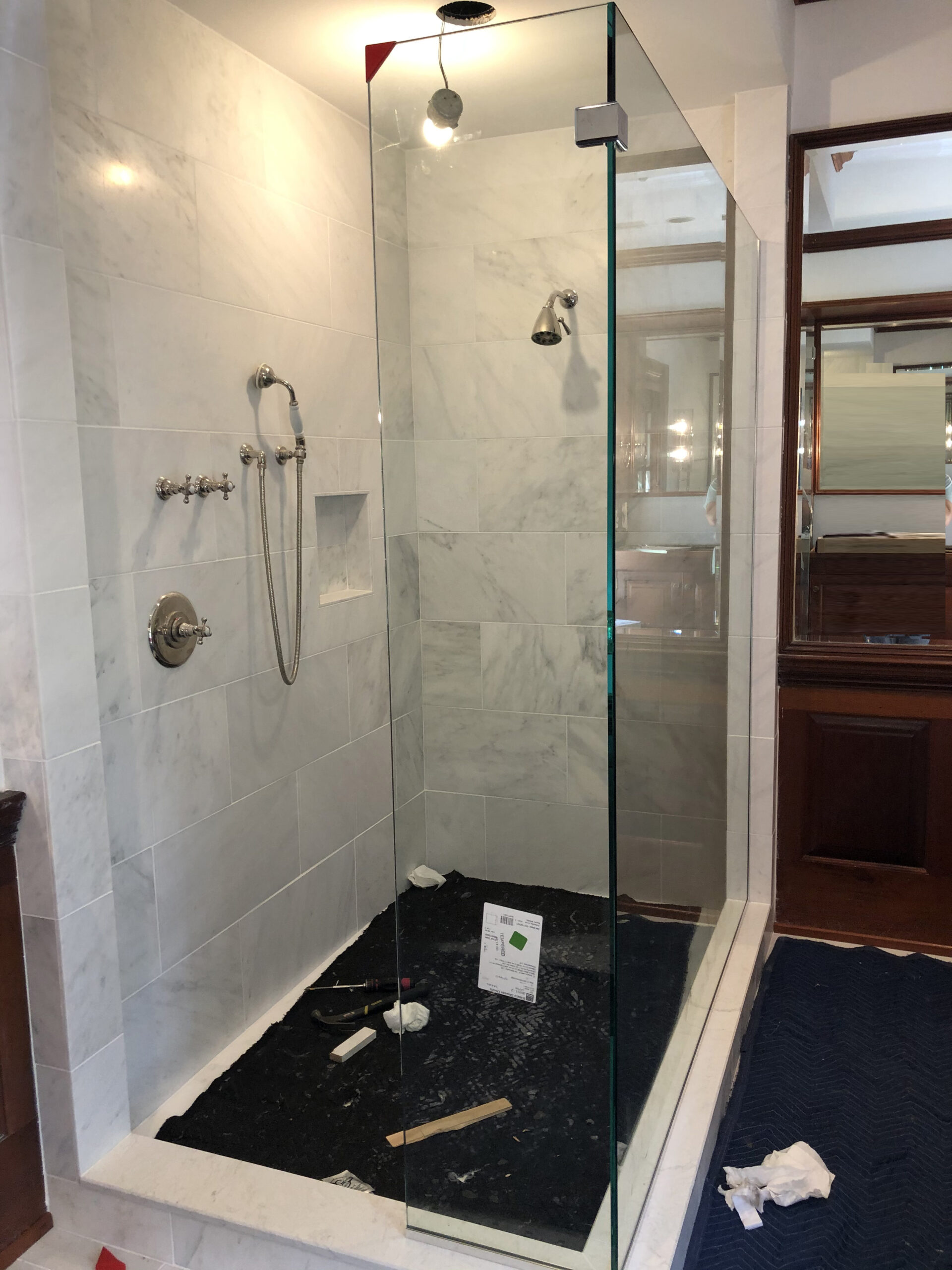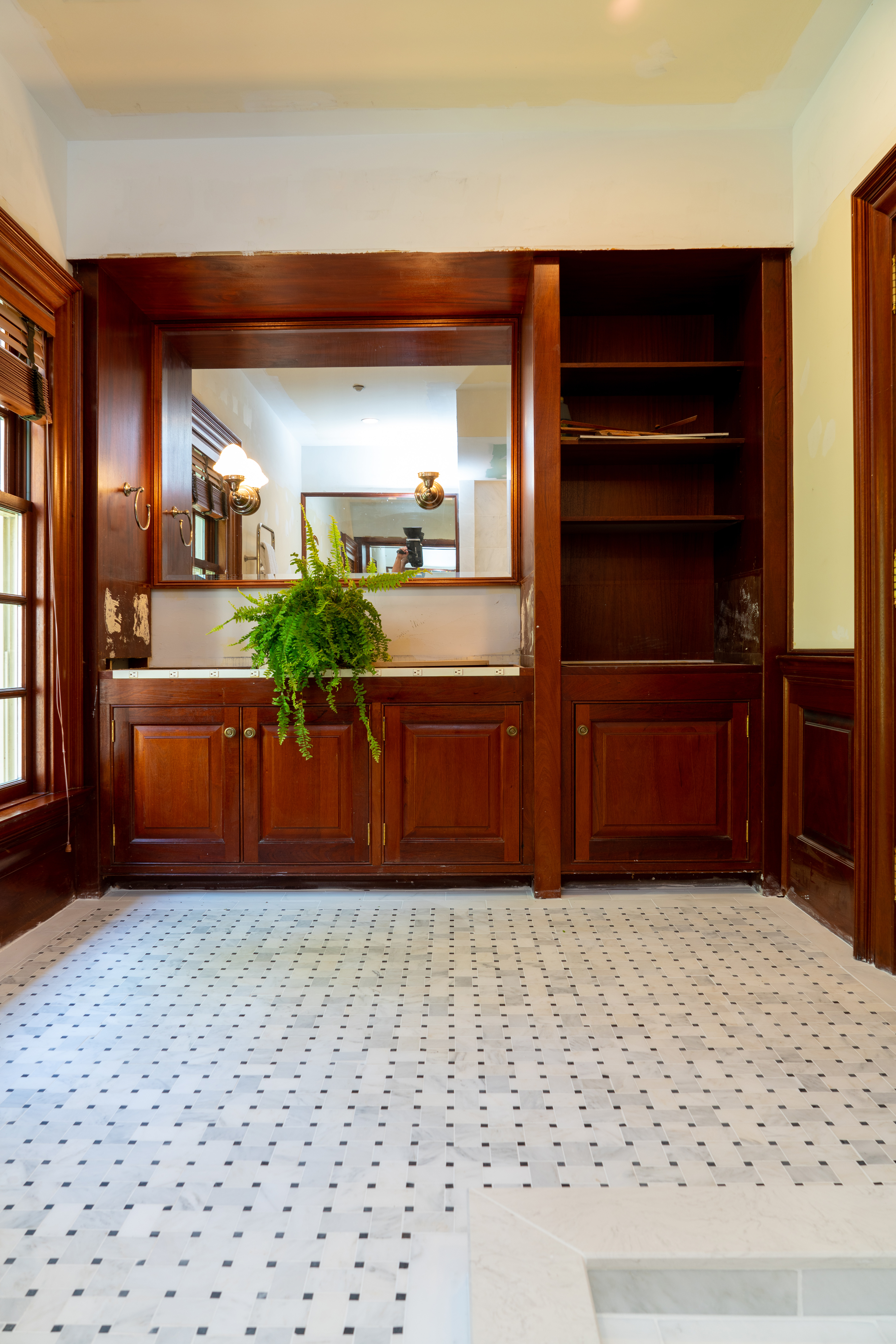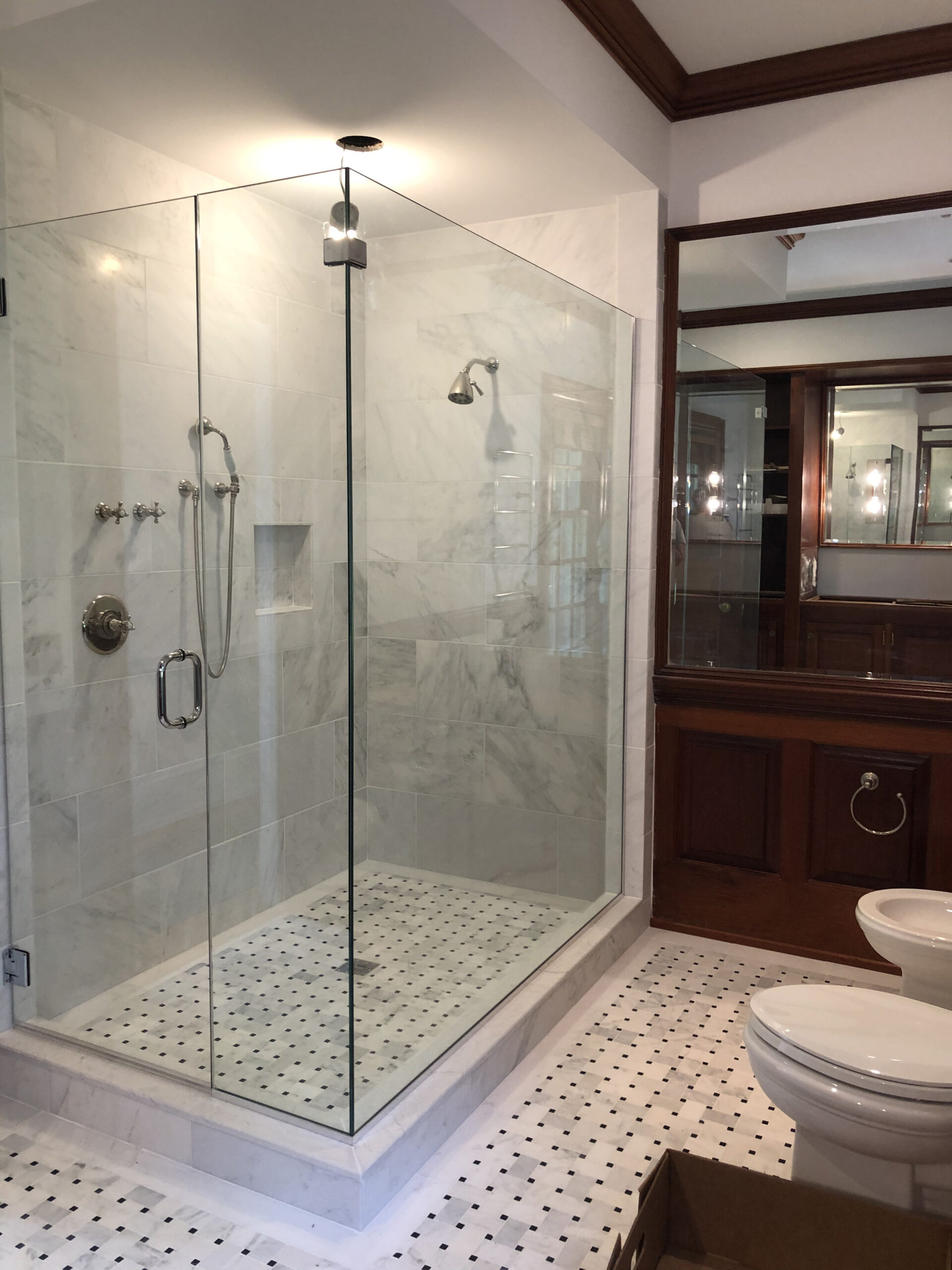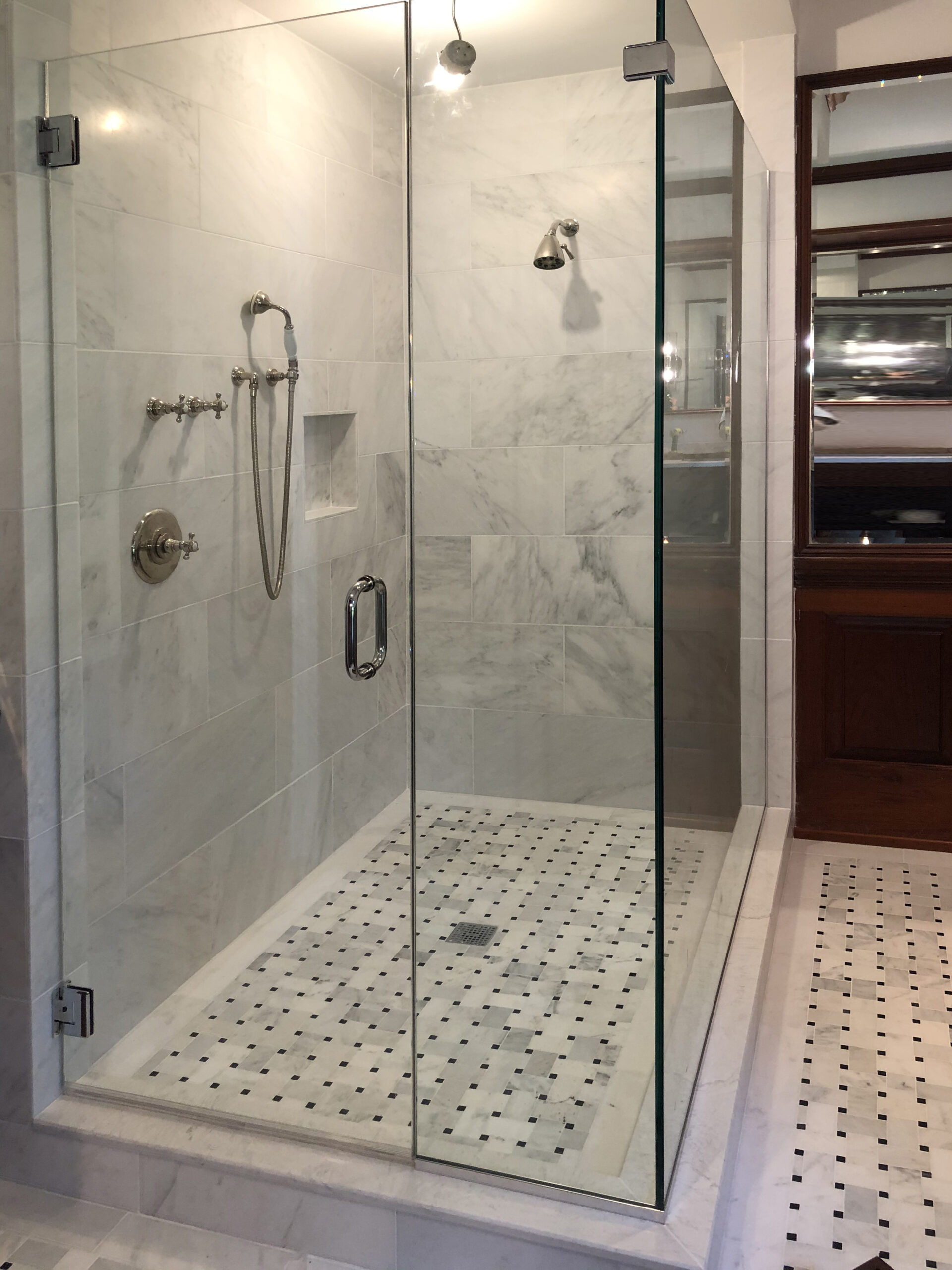 Designing a serene and stylish bathroom that combines modern and natural elements. The main features include a custom wooden cabinet for storage, patterned flooring to add visual interest, a glass-enclosed shower, and a harmonious white and wood color scheme. Together, these elements create a relaxing yet polished atmosphere that enhances both light reflection and overall functionality.