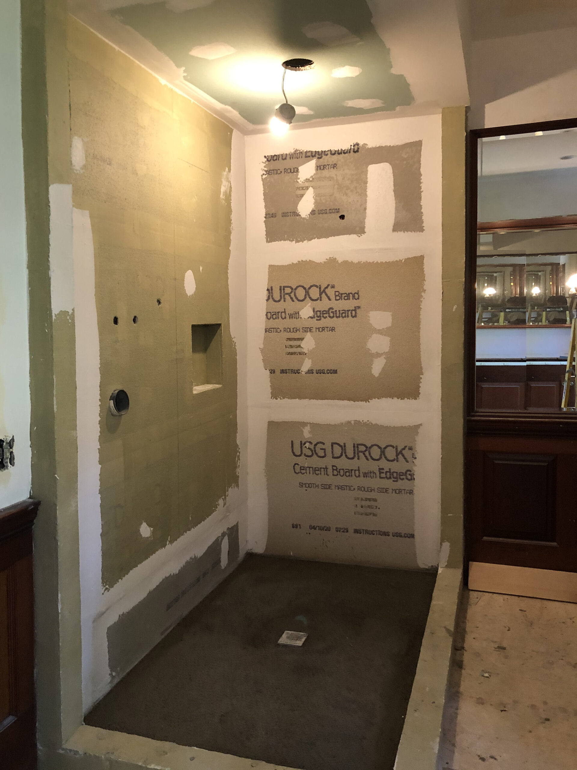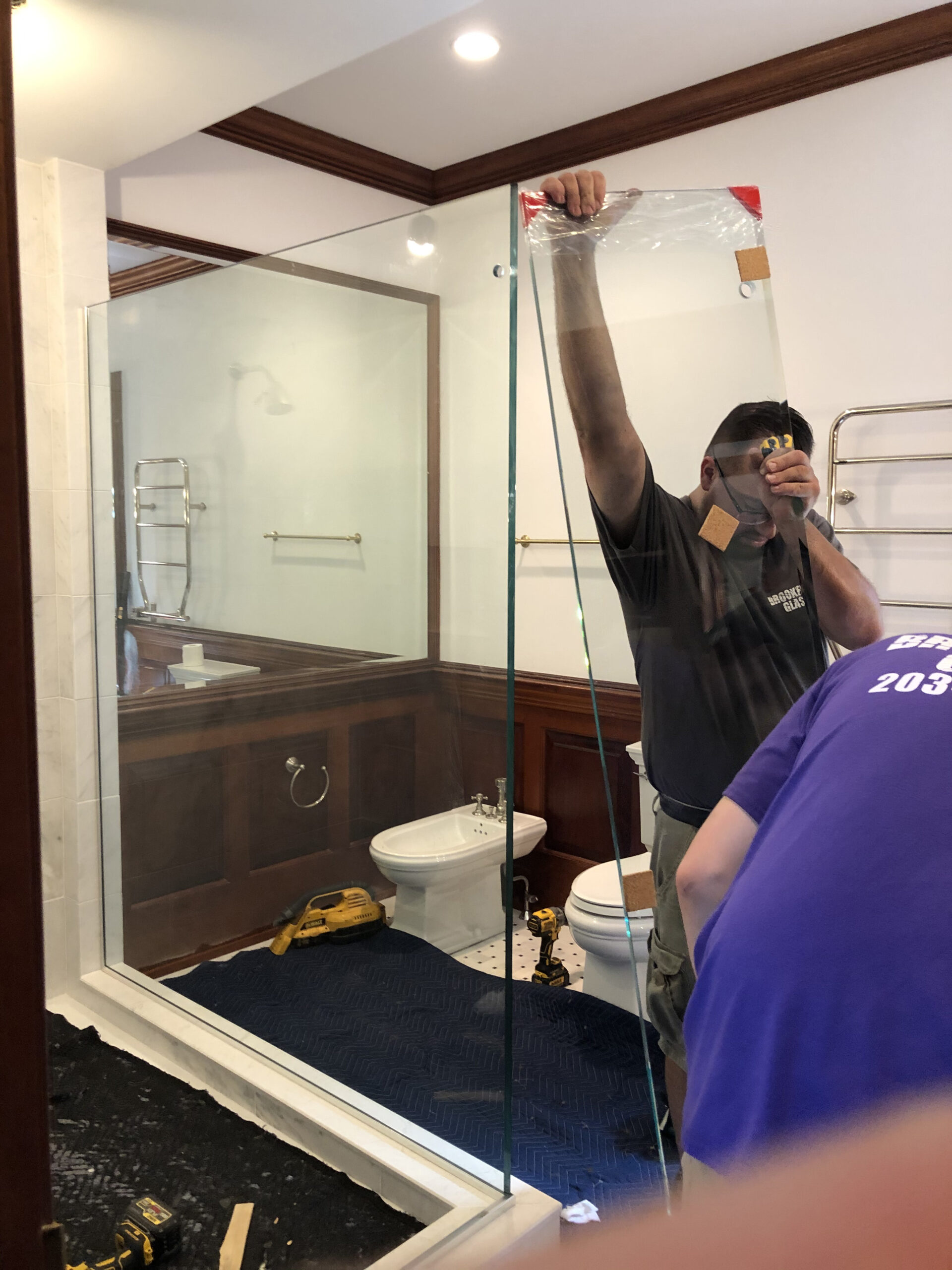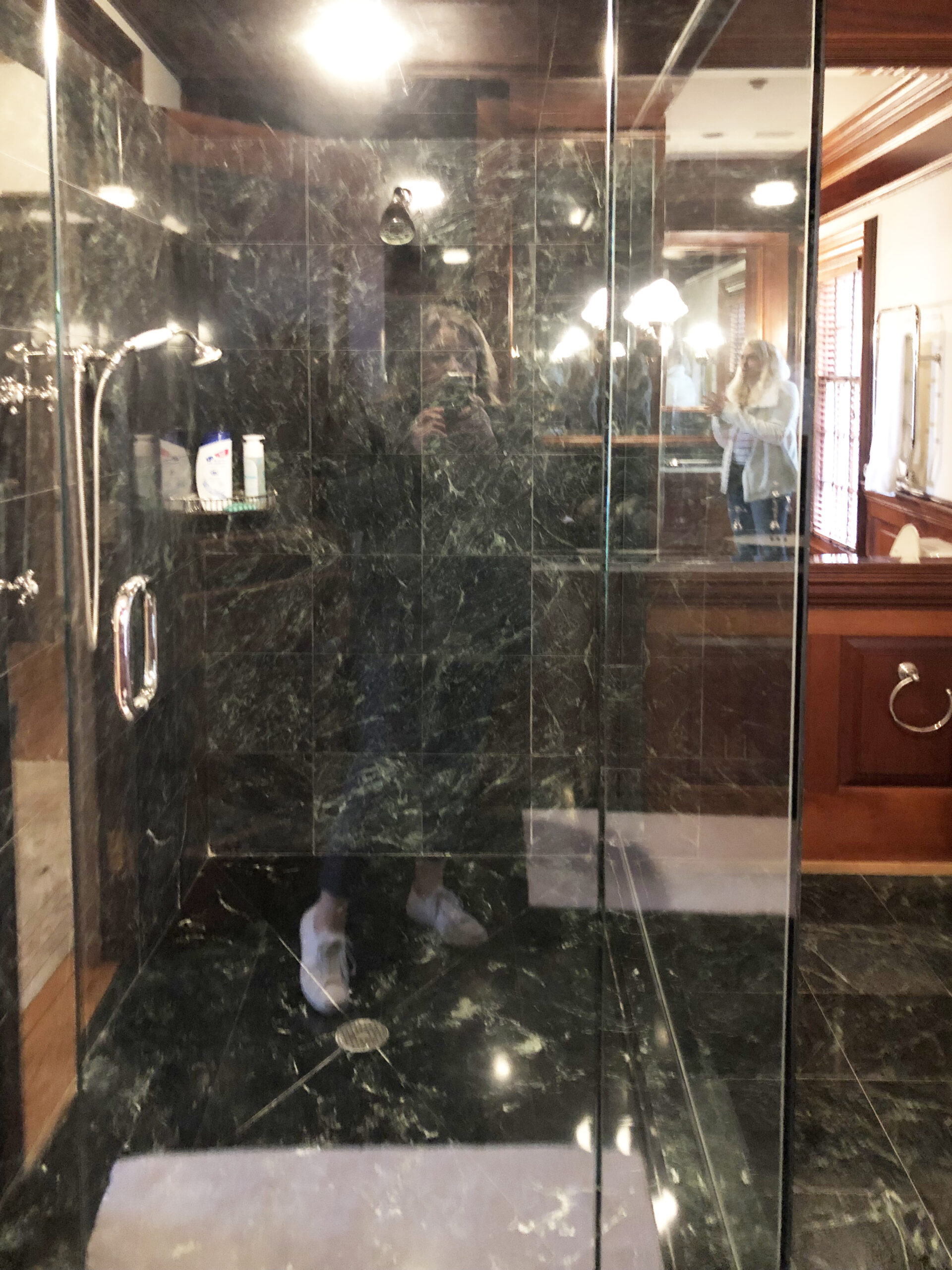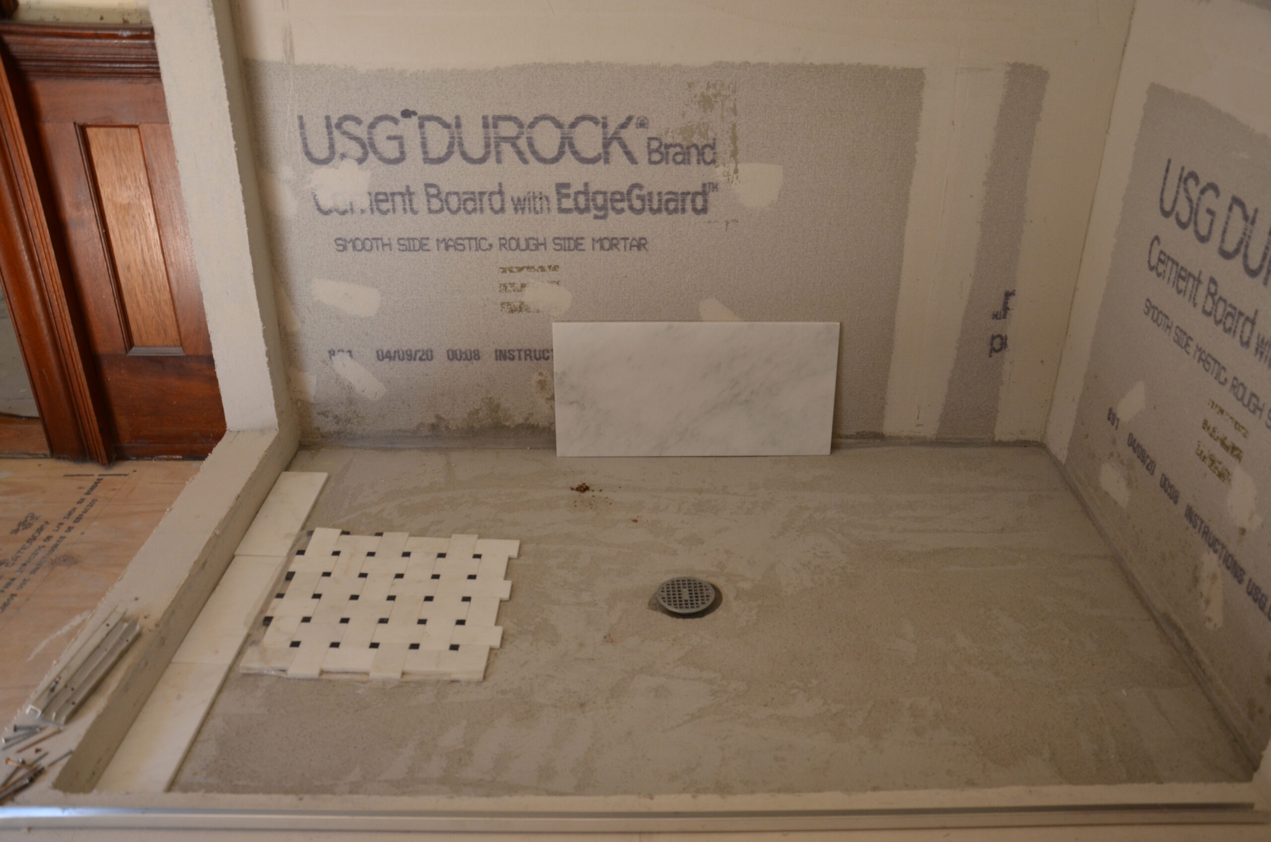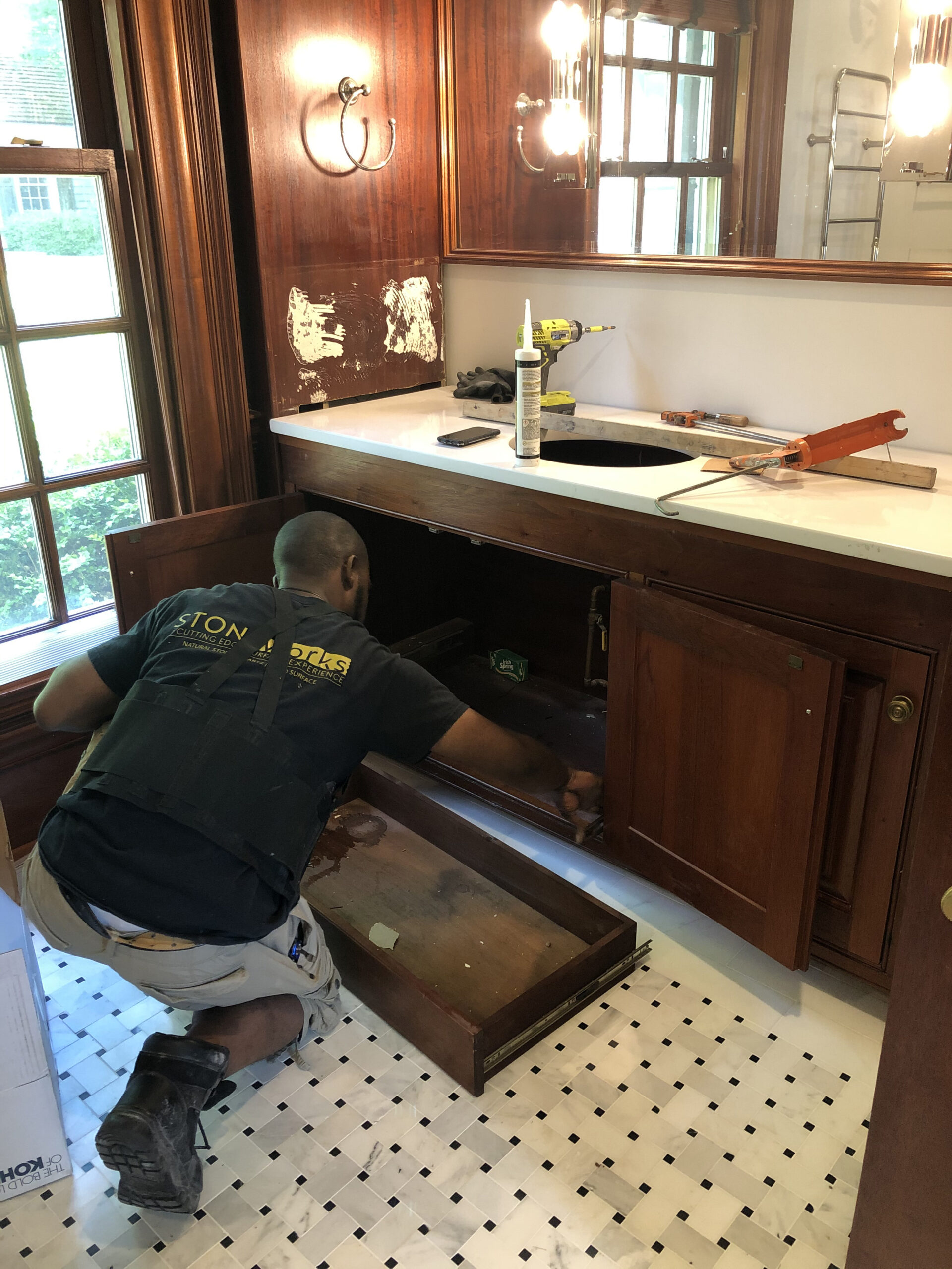 Designing a serene and stylish bathroom that combines modern and natural elements. The main features include a custom wooden cabinet for storage, patterned flooring to add visual interest, a glass-enclosed shower, and a harmonious white and wood color scheme. Together, these elements create a relaxing yet polished atmosphere that enhances both light reflection and overall functionality.