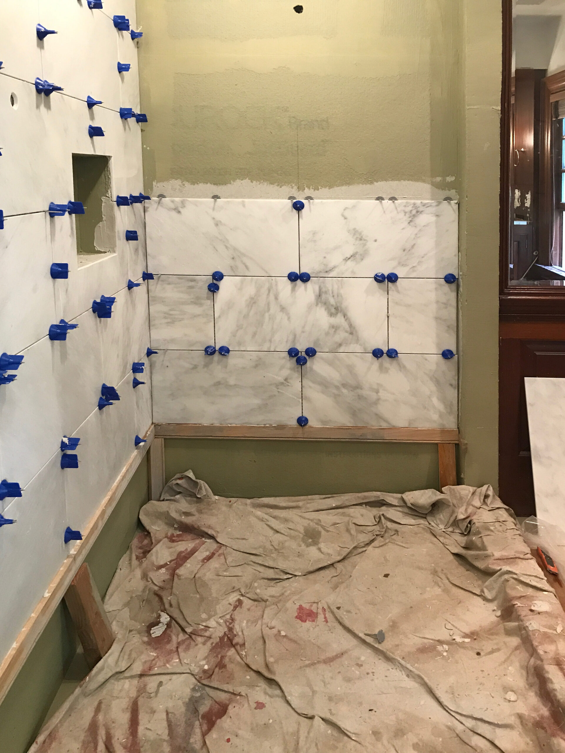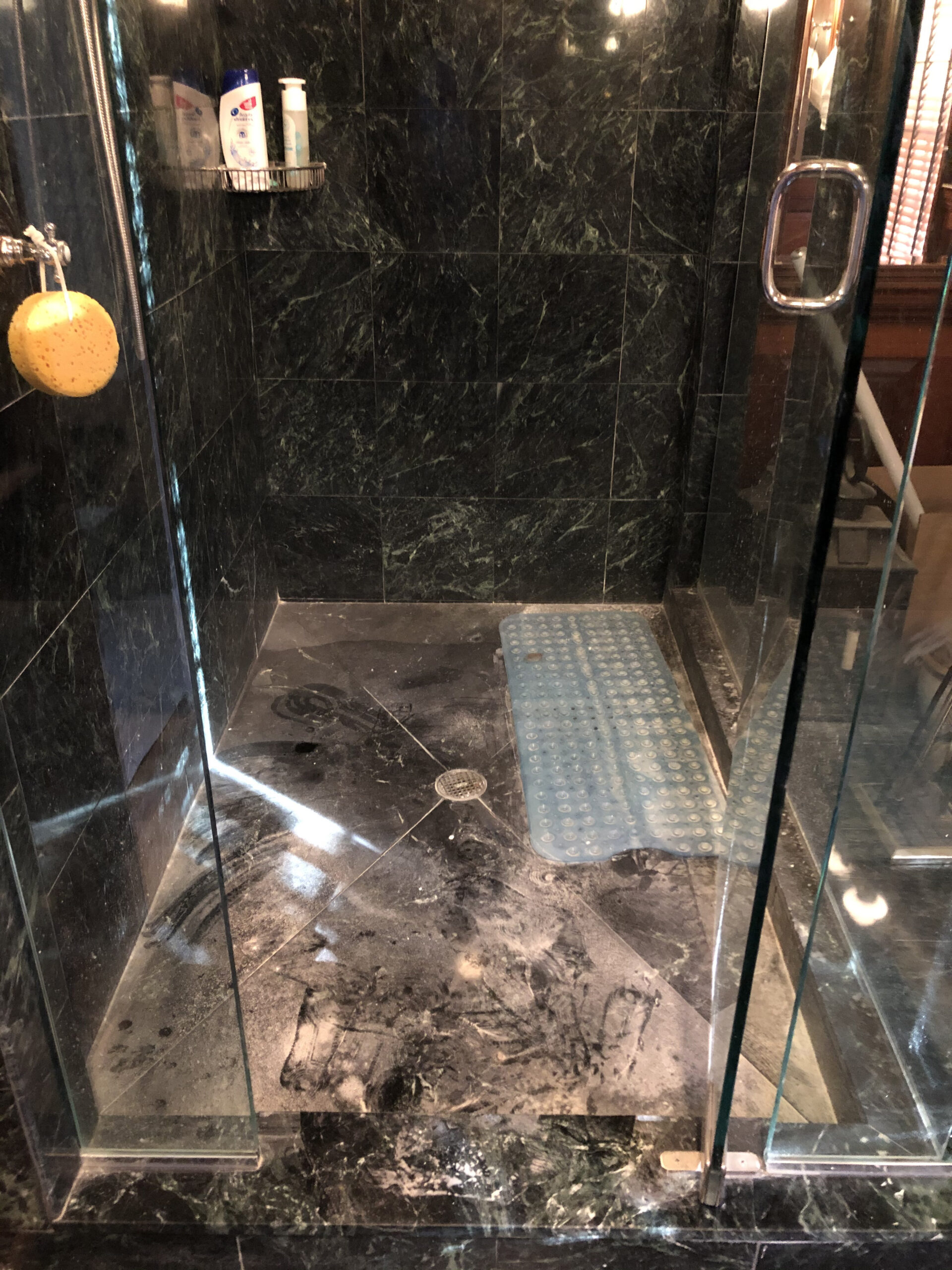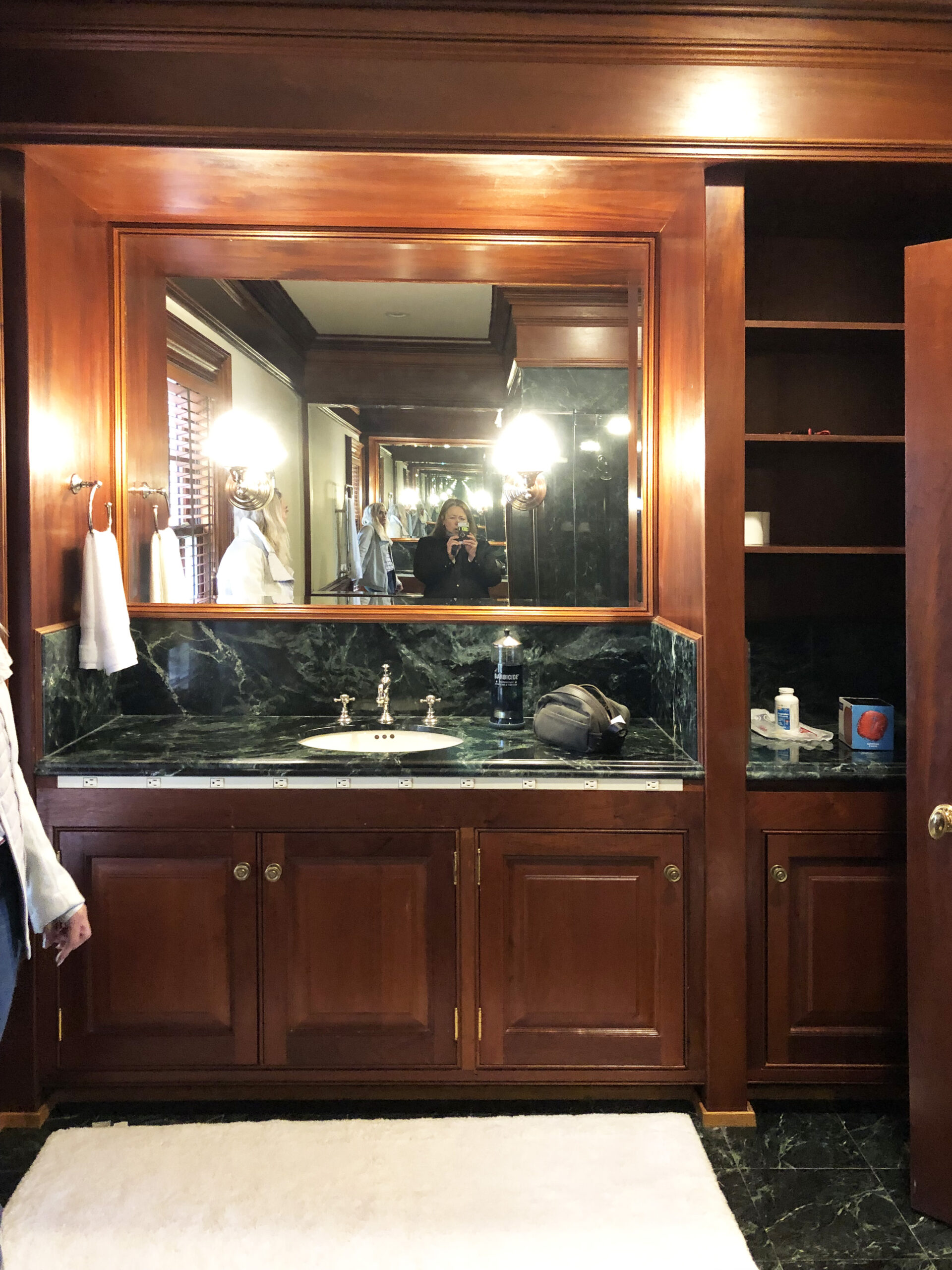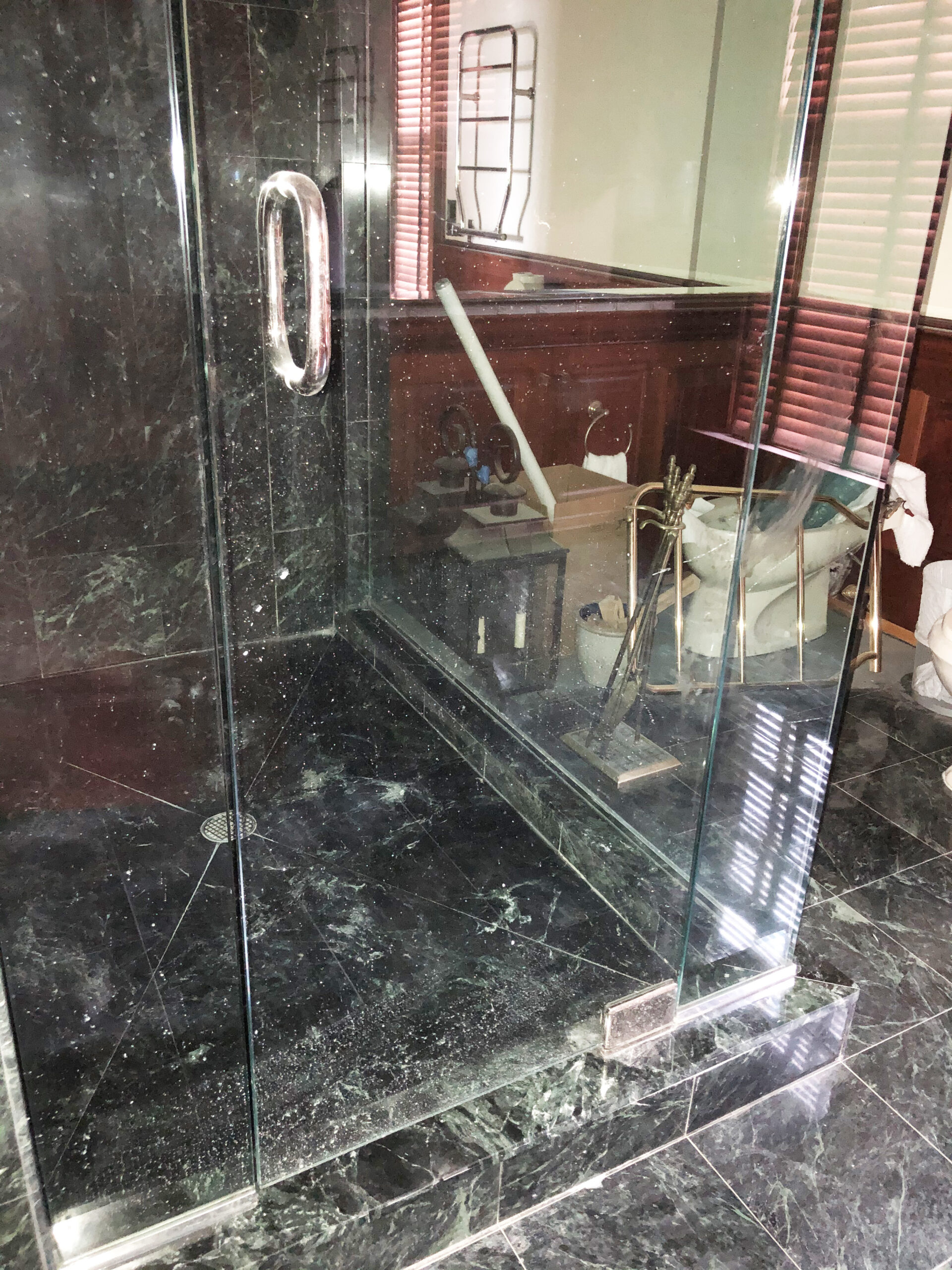Designing a serene and stylish bathroom that combines modern and natural elements. The main features include a custom wooden cabinet for storage, patterned flooring to add visual interest, a glass-enclosed shower, and a harmonious white and wood color scheme. Together, these elements create a relaxing yet polished atmosphere that enhances both light reflection and overall functionality.