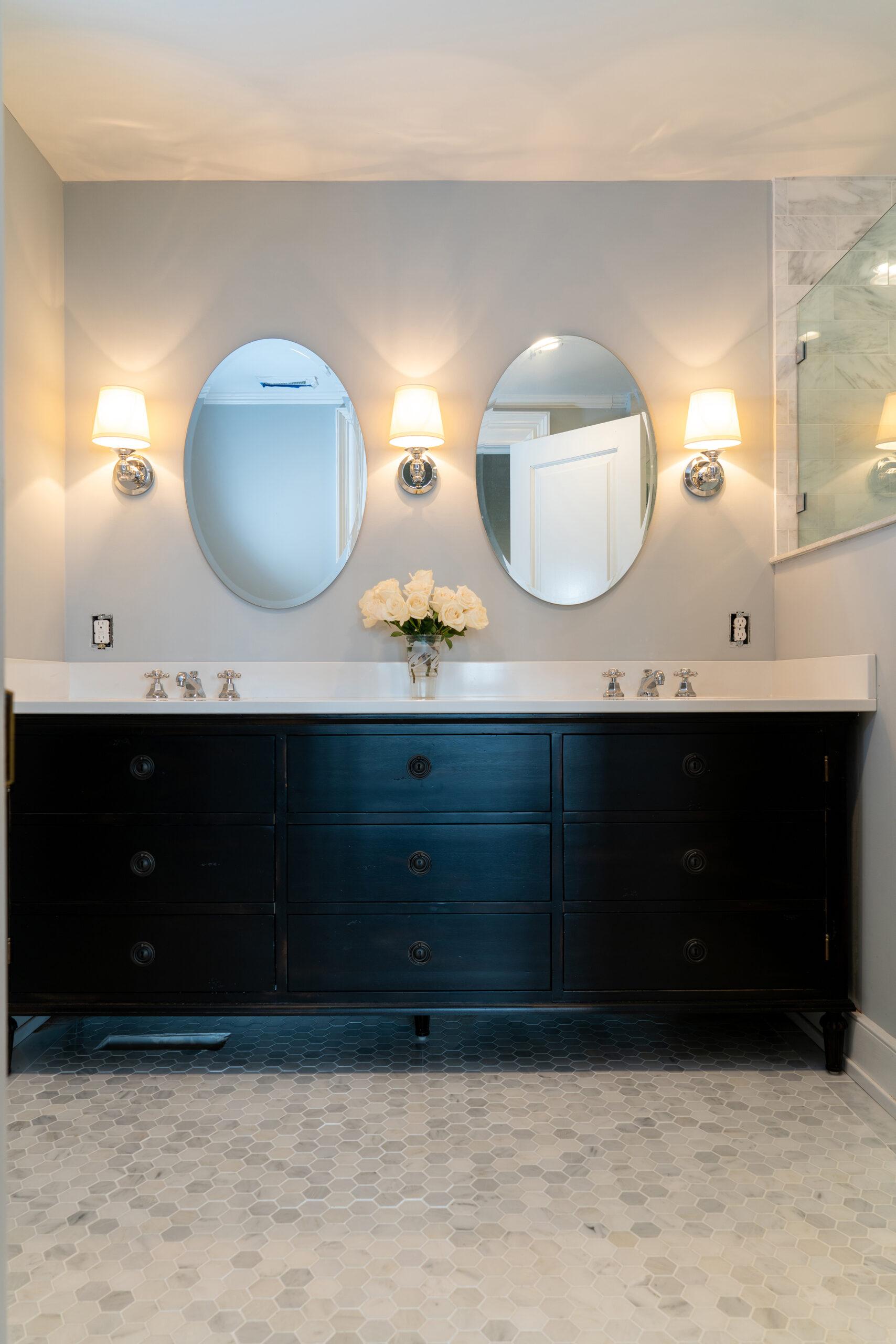 Bathroom design that seamlessly combines modern aesthetics with functionality. It features an elegant vanity cabinet, a glass shower enclosure for a spacious feel, an intricate floor pattern for character, and strategic lighting to brighten the room. The result is a visually appealing and practical space perfect for relaxation and personal care.